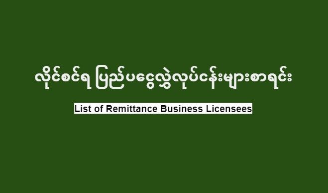 လိုင်စင်ရ ပြည်ပငွေလွှဲလုပ်ငန်းများစာရင်း List of Remittance Business Licensees
