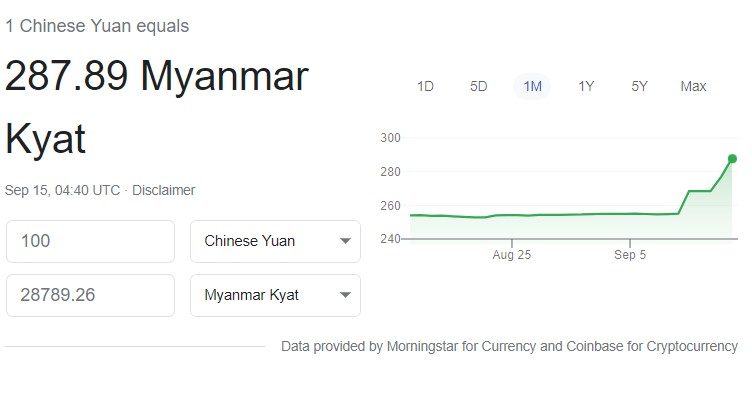 ယခု စက်တင်ဘာလ အတွင်းမှာပင် တရုတ် ၁ ယွမ်ကို ကျပ် ၅၀ ဝန်းကျင်မြင့်တက်သွားပြီး ထိုင်း ၁ ဘတ်ကိုလည်း ကျပ် ၁၀ ကျော် မြင့်တက်သွားခြင်းလည်းဖြစ်သည်။